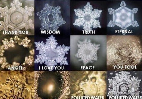 τα οποία υποβλήθηκαν σε ποικίλες μορφές εξωτερικής επιρροής. Οι επιδράσεις που προκαλούνται στο νερό καταγράφονται με την ταχεία κατάψυξή του σε κρυογονικό θάλαμο.